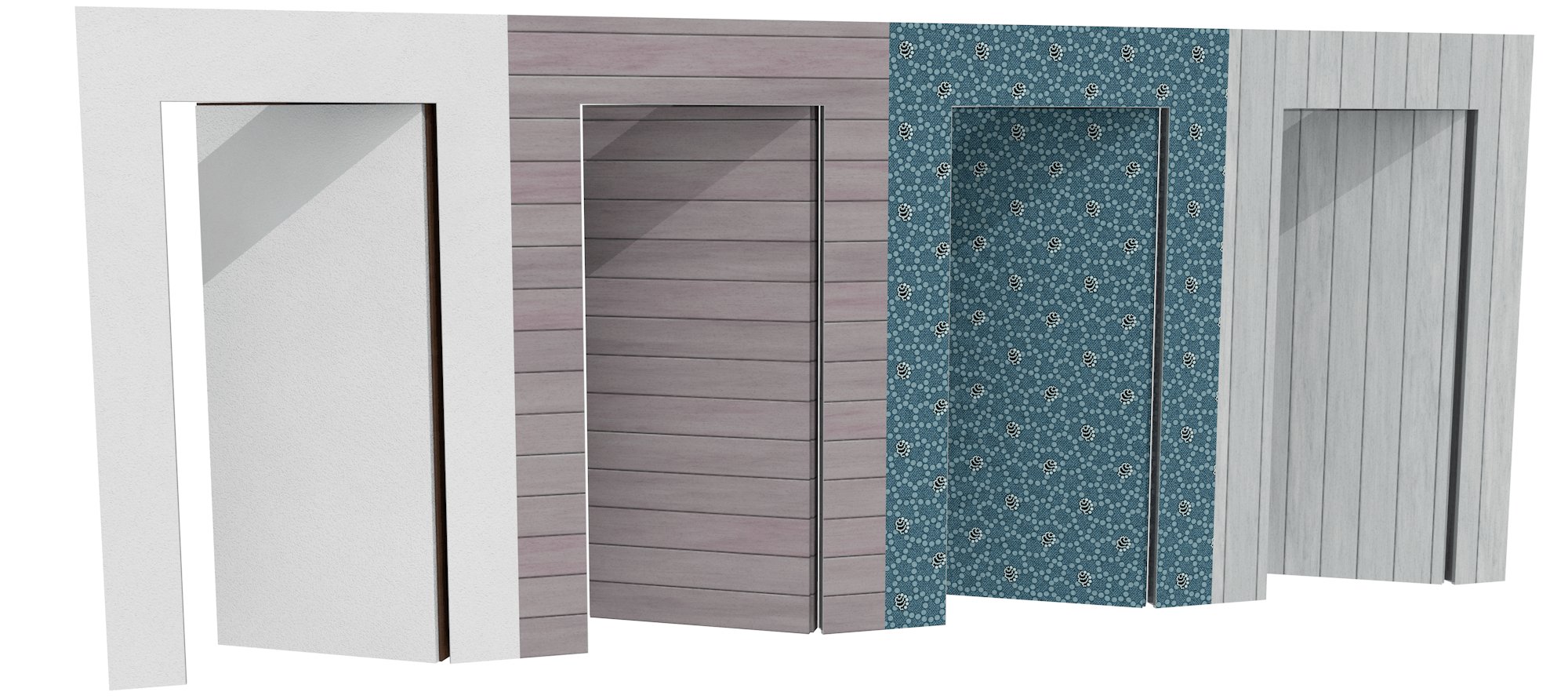 Et pour un rendu, vous devrez en plus compléter la 3D à l’aide de murs, de poutres ou de profils complexes afin de prolonger vos plinthes et moulures pour donner à votre porte l’apparence d’une vraie porte sous tenture.